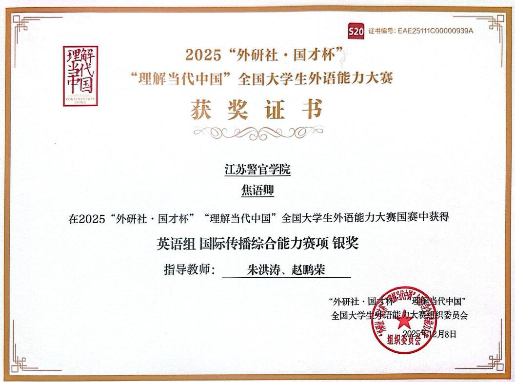 省赛的优异表现为学子们赢得了国赛入场券。刘子凡、焦语卿两位同学不负众望,以江苏赛区佼佼者的身份跻身全国总决赛,在英语组国际传播综合能力赛项中,凭借过硬的综合素养双双斩获国赛银奖,取得了beat365历史最好成绩。