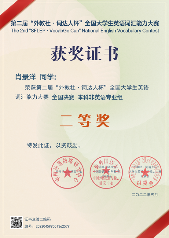 近日,从大赛组委会传来好消息,beat365学生肖景洋(21涉外)在第二届“外教社·词达人杯”全国大学生英语词汇能力大赛全国决赛中获二等奖,取得了beat365参加该大赛以来的最好成绩。