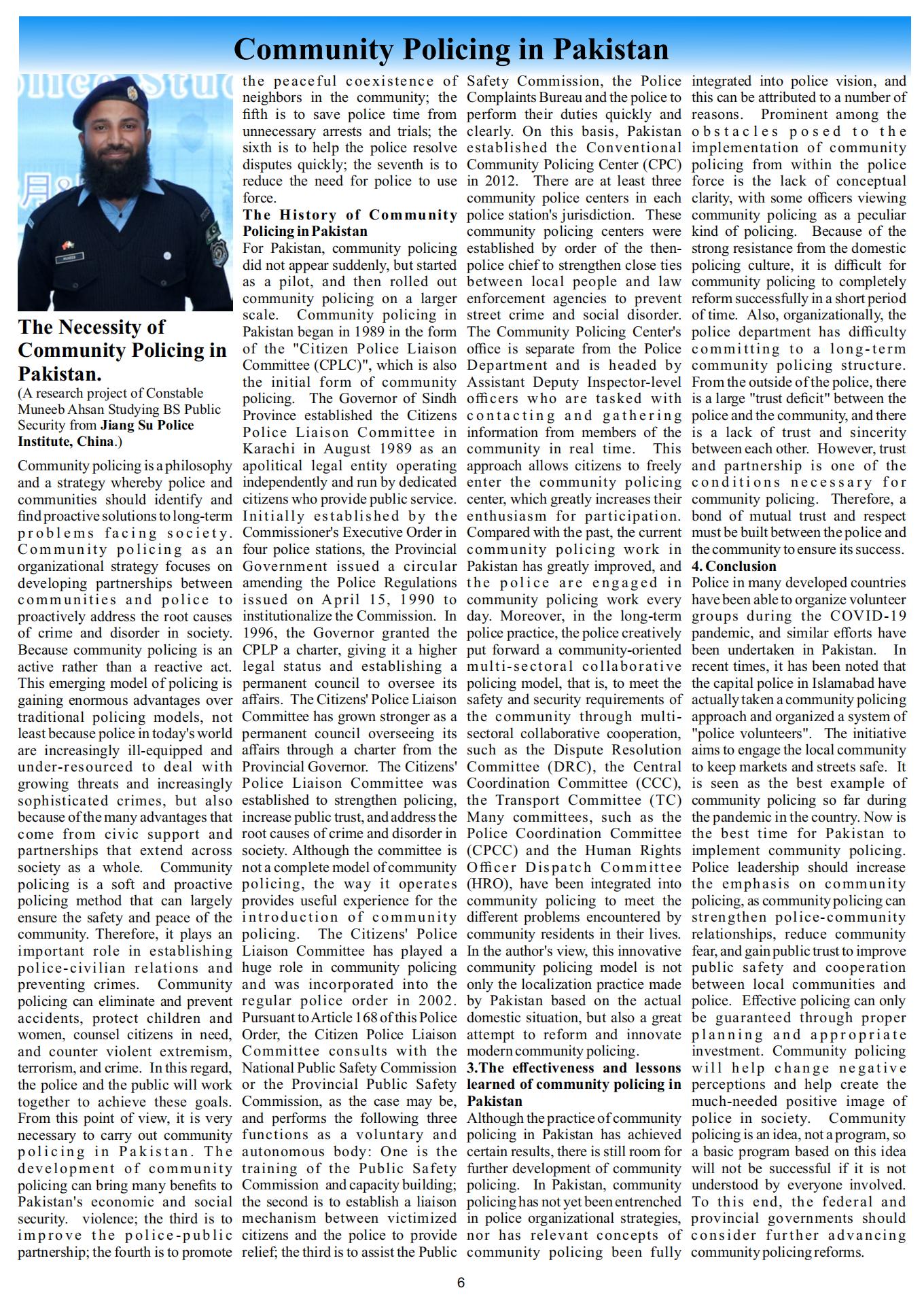 beat365巴基斯坦籍警务留学生孟沙(Muneeb Ahsan)在《伊斯兰堡首都警察局报》(Tarjuman The Capital Police Islamabad)2023年2月12日版整版发表“巴基斯坦社区警务”文章。文章围绕巴基斯坦开展社区警务的必要性、历程和成效得失等三个方面,为巴基斯坦社区警务工作建言献策。