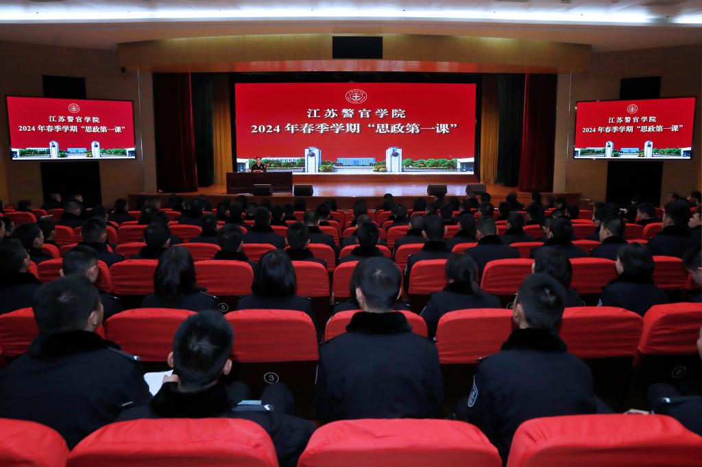3月8日下午,省公安厅党委委员、学院党委书记夏存喜给全体本科生、警务硕士研究生讲授“思政第一课”,勉励大家深入学习贯彻习近平文化思想,做自信自强的新时代预备警察,为建功新时代、奋进新征程做好思想和精神上的充分准备,更好完成党和人民赋予的光荣使命和神圣职责。