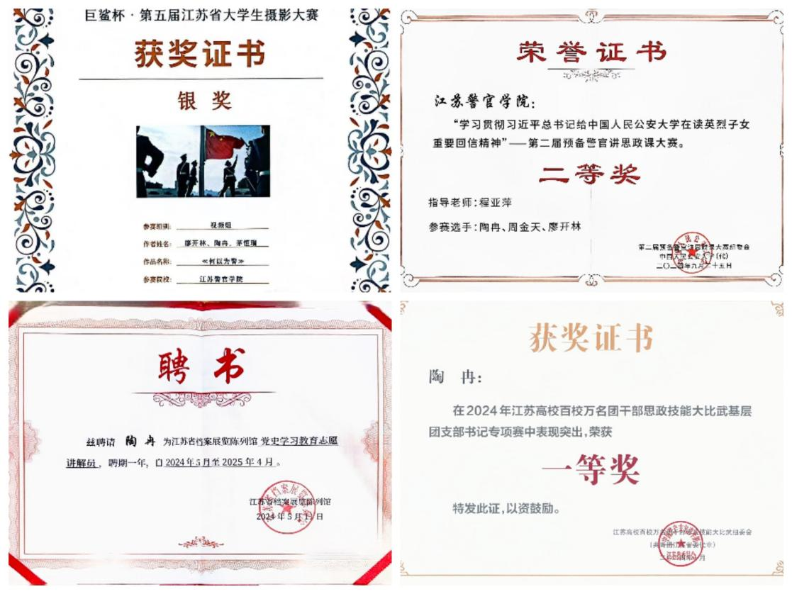 陶冉同学入校以来,始终坚守从警初心,刻苦学习训练,勇于创新实践,先后在全国公安院校预备警官讲思政课大赛、第四届江苏高校百校万名团干部思政大比武系列比赛、第五届江苏省大学生摄影大赛、江苏省大学生创新大赛校赛中取得优异成绩,在校综合素质测评名列前茅。