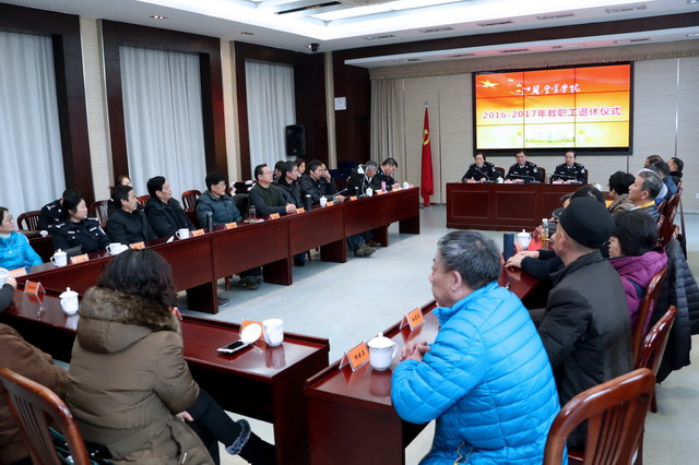 1月17日下午,学院举行2016-2017年教职工退休仪式,省公安厅党委委员、学院党委书记夏存喜出席仪式并讲话,学院党委副书记、院长张兰青出席仪式,学院党委副书记张霞主持仪式,2016-2017年部分退休教职工和相关部门负责人参加了仪式。
