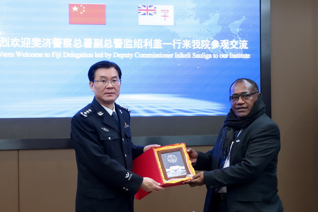 会谈结束后,斐济警察代表团一行还参观了学院图书馆、指纹博物馆、枪械博物馆等教学设施和校园环境,代表团一行对学院的发展建设表示赞赏。(文/外事办公室,图/徐兆海)