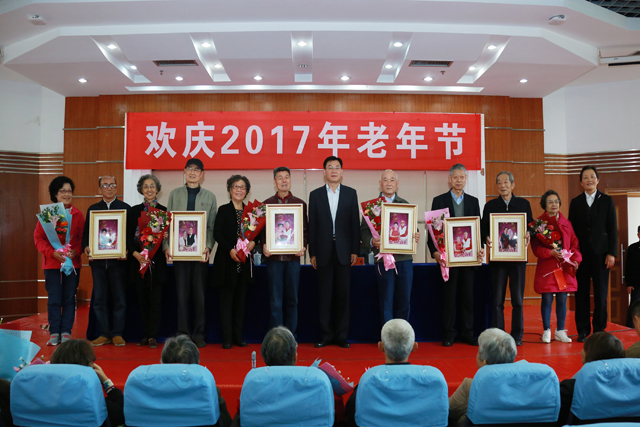 在党的十九大胜利闭幕的喜庆日子里,我们迎来了2017年重阳节和第五个老年节。10月28日上午,省公安厅党委委员、学院党委书记夏存喜到安德门校区老年活动中心,与学院170余名离退休老同志欢聚一堂,共同庆祝节日,并为过整岁生日的老同志祝寿,为金婚夫妇颁发纪念照。学院党委副书记张霞主持庆祝会。