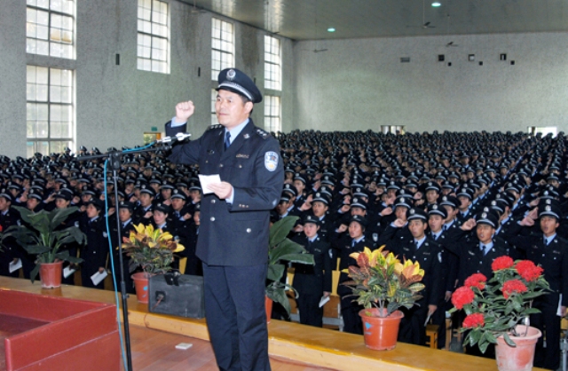 10月15日下午,学院在龙潭校区隆重举行2007级公安类专业学生入警宣誓仪式。在人事处副处长万有林的领誓下,校区1540名2007级新生身着新警服,面对警徽,庄重严肃地进行了宣誓。仪式由校区管委会主任王建伟主持。院党委副书记赵远同志作了讲话,他要求全体同学牢记入警誓言,用实际行动践行自己的诺言。经侦专业倪旭栋同学代表全体新生作了表态发言。