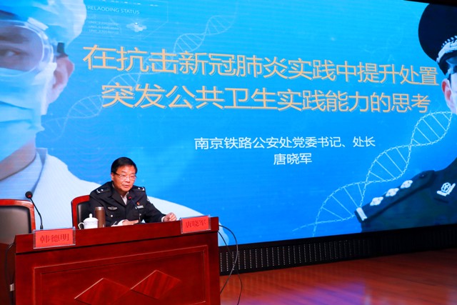 邹智勇以《江苏数据战“疫”的阶段性回顾与思考》为题,分五个阶段全面回顾了疫情发生以来,江苏公安机关如何利用警务大数据平台为全省乃至全国疫情防控所做的工作,对接下来如何完善大数据平台机制、提升全省警务大数据作战能力进行了系统梳理和思考,对加强与学院大数据方面的“战教合作”提出了建议。唐晓军以《在抗击新冠肺炎疫情实践中提升处置突发公共卫生事件能力思考》为题,回顾了南京铁路公安处在疫情发生以来,如何通过“信息共享、联勤联动、协同高效、运行顺畅”路地警务协作机制,利用大数据优势,有效阻断疫情蔓延的工作过程,并反思了公安机关如何进一步利用数据赋能提升处置突发公共卫生事件能力的路径。