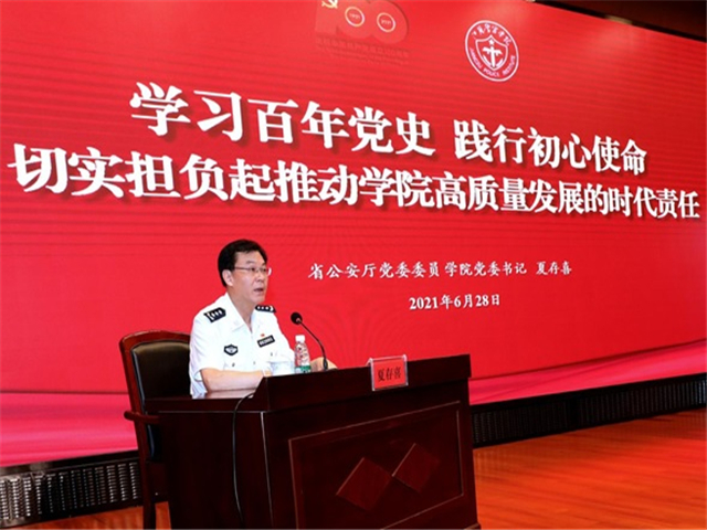 6月28日,在中国共产党即将迎来百年华诞之际,省公安厅党委委员、学院党委书记夏存喜为干部教师讲授专题党课,围绕学习贯彻习近平总书记关于党的历史重要论述精神和对教育工作、公安工作、江苏工作重要讲话指示精神,结合人民公安发展历程、高等教育发展变迁,交流党史学习体会,对深学红色历史、汲取智慧力量,加快推动学院高质量发展提出要求。
