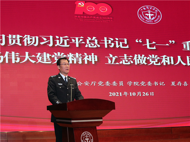 夏存喜在讲课中指出,习近平总书记在庆祝中国共产党成立100周年大会上的重要讲话,贯通历史、现实、未来,贯通伟大斗争、伟大工程、伟大事业、伟大梦想,高屋建瓴、思想深邃、内涵丰富。全体学生要认真学习贯彻习近平总书记“七一”重要讲话精神,深刻领会全面建成小康社会的伟大历史性成就,深刻领会党团结带领人民不懈奋斗的光辉历程和伟大成就,深刻领会以史为鉴、开创未来的根本要求,深刻领会习近平总书记代表党中央发出的伟大号召,深刻领会伟大建党精神的鲜明特质和时代价值,切实增强做中国人的志气、骨气、底气;要深刻领会伟大建党精神的丰富内涵,学习传承中国共产党人坚持真理、坚守理想的崇高信仰,践行初心、担当使命的奋斗追求,不怕牺牲、英勇斗争的坚韧品格,对党忠诚、不负人民的政治底色,不断增强传承红色基因的思想自觉、政治自觉、行动自觉;要弘扬伟大建党精神,砥砺政治品格、筑牢忠诚警魂,增强使命自觉、锤炼过硬本领,严明纪律作风、塑造良好形象,站稳人民立场、厚植为民情怀,努力把自己锻造成为不负时代、不负韶华、不负党和人民期望的忠诚卫士。
