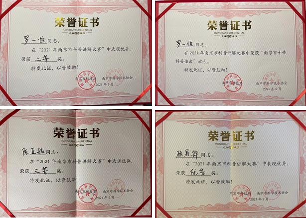 在博物馆老师的指导下,由罗一恒、陈直航、顾晟铧、程嘉怡(领队)等四位同学组成的参赛小队,在选题、素材收集、讲解稿撰写、PPT制作等环节进行了认真准备。经过两天激烈角逐,三位参赛选手均获奖,其中,罗一恒同学荣获二等奖的同时,获“南京市十佳科普使者”称号。