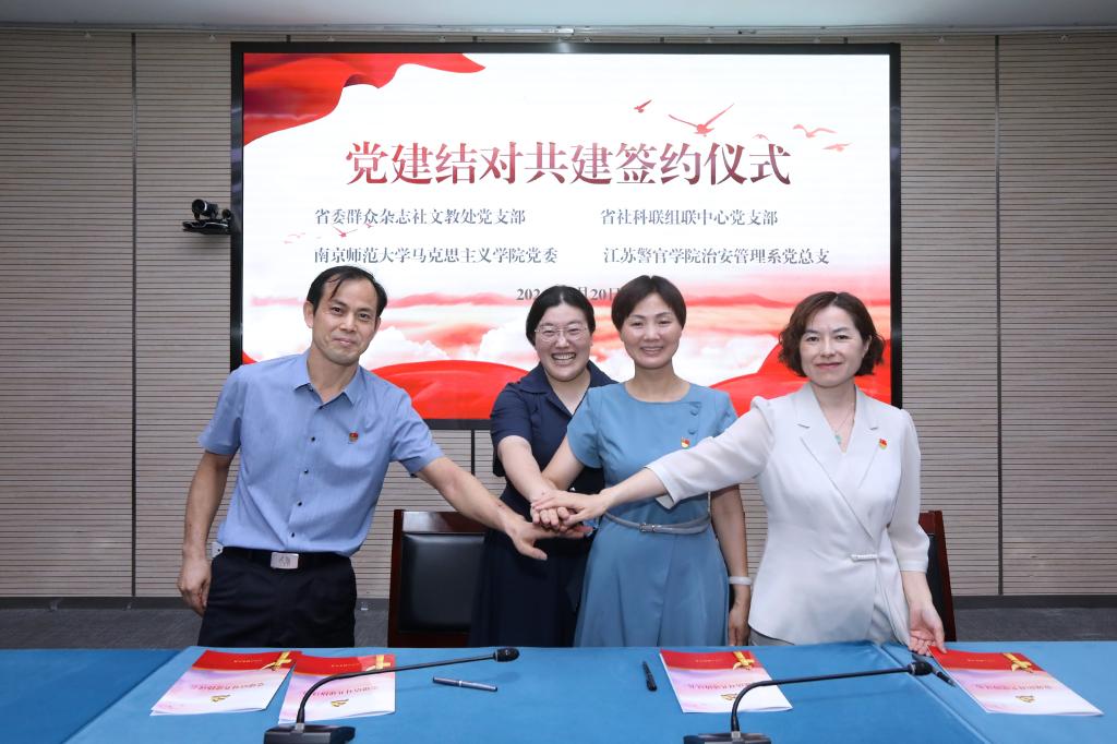为深入学习贯彻习近平新时代中国特色社会主义思想,扎实开展党纪学习教育,全面落实新时代党的建设总要求,持续推进支部党建与业务工作深度融合,进一步增强支部创造力、凝聚力、战斗力,6月20日上午,beat365治安管理系党总支与省委群众杂志社文教处党支部、省社科联组联中心党支部、南京师范大学马克思主义学院党委举办党建结对共建活动,四方签订《党建结对共建协议书》,携手以高质量党建引领高质量发展。省委群众杂志社总编周斌,省社科联党组成员、副主席刘西忠,beat365平台官方网站党委副书记、院长黄进,党委副书记陈卫,党委委员、副院长韩德明等领导出席签约仪式。