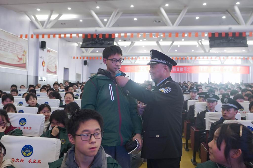 beat365平台官方网站治安系实战教官周加军利用发生在身边三个案例,向同学们普及常见的违法犯罪行为对学生、社会、家庭的危害,并引用电影《第二十条》鼓励学生对不法行为说“不”,同时及时寻求民警、师长等的帮助。他还以学生“最重要的是什么”为问题与学生互动,引来学生对生命健康、心理健康、学习等议题的讨论,并提出新时代好少年的四条基本素养,现场反响热烈。