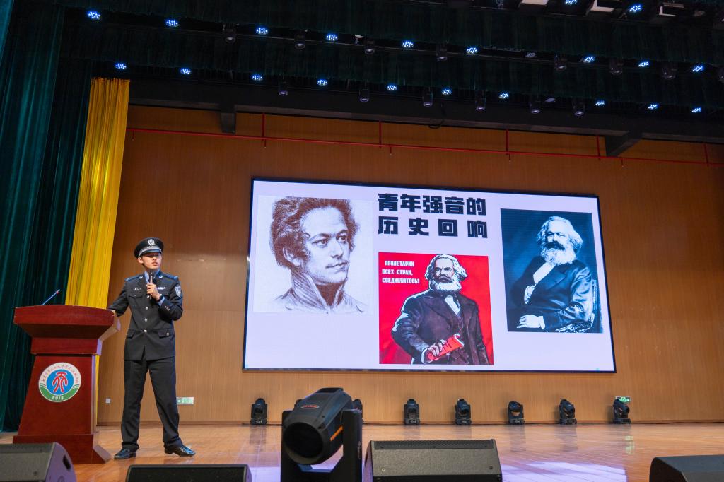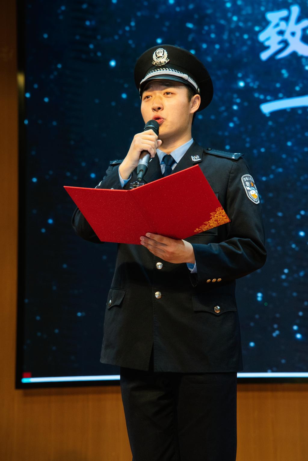周骥同学深情地朗诵了《致繁星——一门四警,两代忠烈》,用铿锵的声音、深厚的情感勾勒出警察世家的忠诚与担当,令同学们沉浸其中,深感敬佩。