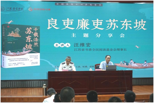 为深入贯彻中央八项规定精神学习教育,树立良好家学家教家风,扎实推进党风廉政建设,营造风清气正育人环境,5月16日下午,图书馆联合学院工会、纪委、团委、学生处邀请江苏省书香全民阅读基金会理事长汪维宏博士来校,为师生作题为《良吏廉吏苏东坡》的讲座。学院党委委员、副院长王奎宏主持参加活动。