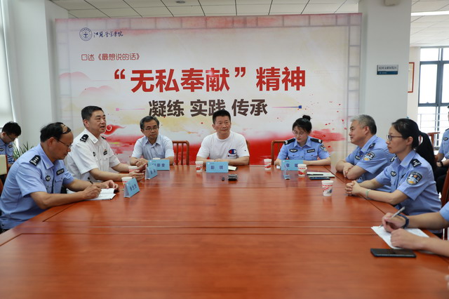 围绕学院“无私奉献”校训精神的凝炼、实践与传承,退休老同志代表、新入职教师分别交流发言。老同志结合自己在校学习、工作的经历,回顾了学院建设发展的光辉历程,讲述了老一辈苏警人始终以“无私奉献”精神为动力,艰苦创业、开拓创新的感人故事,分享了对“无私奉献”校训精神在新时代被赋予的职责与使命的感悟;新教师深情讲述了自己入职学院的坚定和决心,并从学理层面多角度、多层次深刻阐释了“无私奉献”的涵义、价值和现实意义。公安管理系学生一大队老师和学生代表也进行了交流发言。