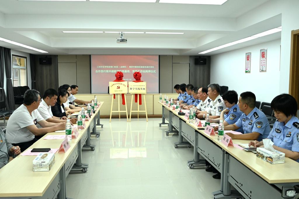 在签约仪式现场,冯红新和南京市秦淮区瑞金路街道工委副书记、办事处主任李军共同签定合作协议,并为共建教学实践基地揭牌。安德门校区党总支副书记、管委会政委孙伟斌和瑞金路街道工委副书记、政法委员陶莹莹共同为安德门校区党员工作站揭牌。
