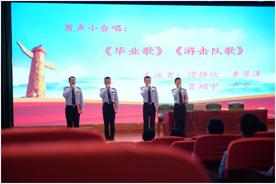 在红歌合唱环节,《游击队歌》《毕业歌》以强烈的感情表达了当时中国人民空前高涨的斗争热情以及对反帝斗争取得胜利的希望和信心,慷慨激昂的歌曲,愈发激起了广大青年的爱国热情和报国之志。师生组合嘹亮的歌声回荡在会场,传递着苏警院师生们朝气蓬勃、奋发向上的满腔热情。