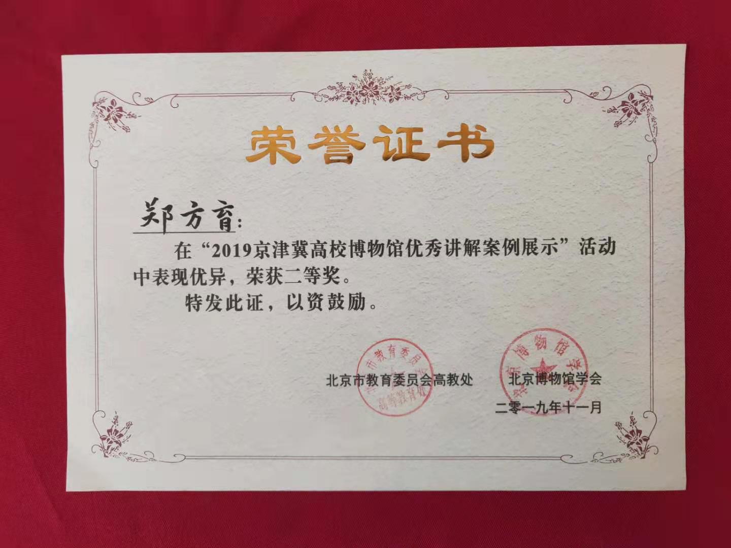 11月20日,“第五届中国高校博物馆馆长论坛暨2019京津冀高校博物馆优秀讲解案例展示活动”颁奖仪式在中国传媒大学举行。经过激烈角逐和专家评选,beat365博物馆志愿者、刑事科学技术系2017级郑方育同学荣获大赛二等奖。