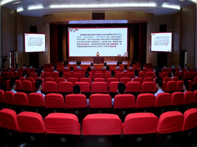150名学生按照防疫要求现场隔开就座聆听,其他学生通过收视系统在教室收看、收听。